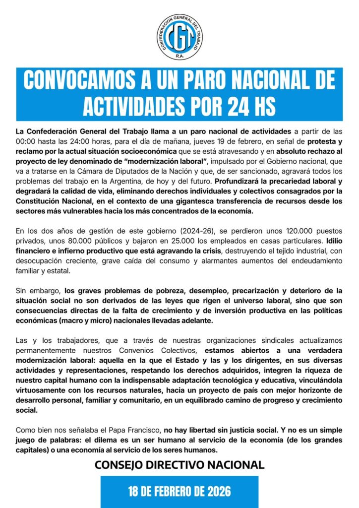 Sin embargo, remarcaron que el desenlace no depende de la CGT sino de la voluntad de los bloques parlamentarios. “Quienes votan son los diputados. Ellos representan al pueblo argentino y deben asumir esa responsabilidad”, señalaron.