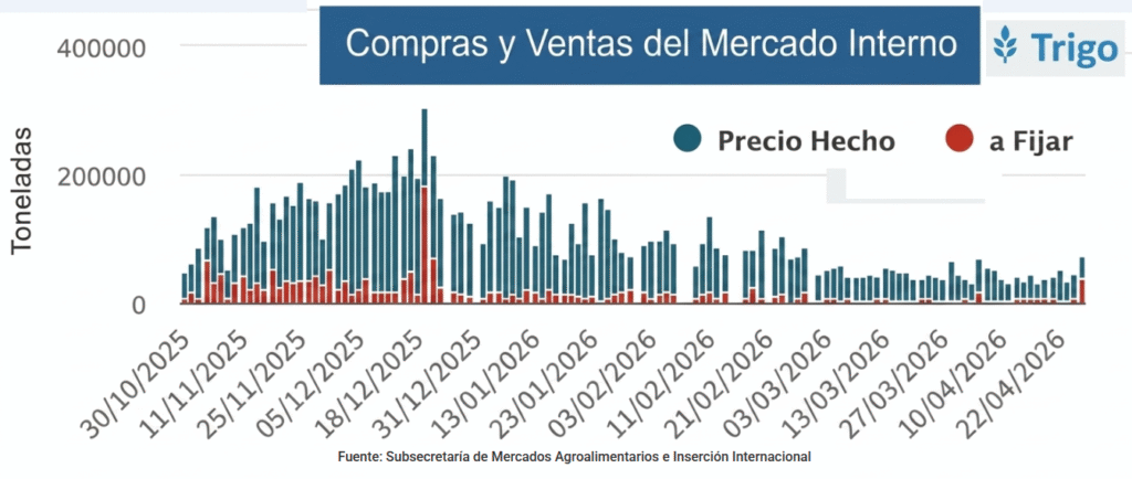 Mientras que la exportación al pasado 15 de abril –último dato oficial disponible– había comprado 14,47 millones de toneladas de trigo 2025/26 versus 9,66 millones en la misma fecha del año pasado, la molinería había adquirido para entonces 2,60 millones de toneladas, una cifra similar a la registrada al 15 de abril de 2025 (2,65 millones).