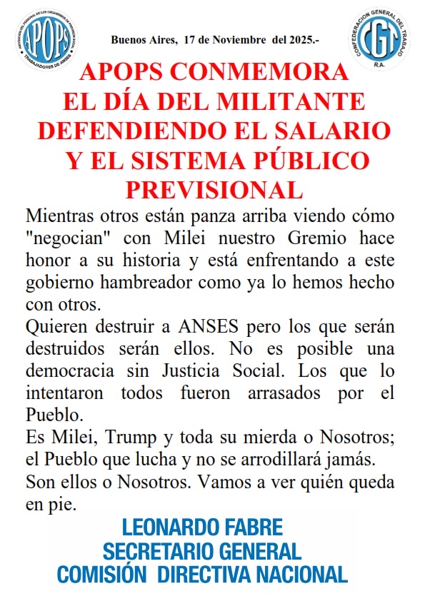 En el marco del Día del Militante, la Asociación del Personal de los Organismos de Previsión Social (APOPS) difundió un comunicado de fuerte tono político en el que reivindica la defensa del salario y del sistema previsional público. Su secretario general, Leonardo Fabre, profundizó esos conceptos en diálogo con ELDELEGADO, apuntando directamente contra el Gobierno nacional.
