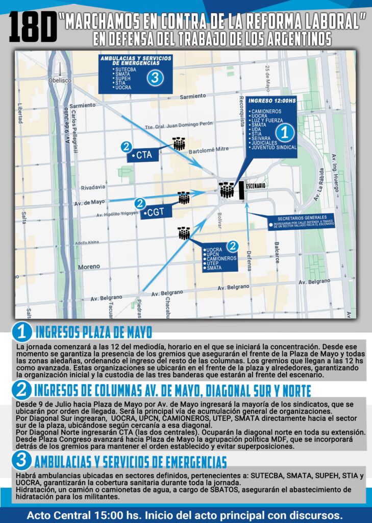 Desde temprano, columnas sindicales comenzaron a concentrarse en distintos puntos de la Ciudad de Buenos Aires, con un operativo que prevé un acto central y la lectura de un documento consensuado. Allí se espera un duro pronunciamiento contra lo que definen como un “modelo de exclusión” y una advertencia sobre las consecuencias sociales de profundizar el ajuste.