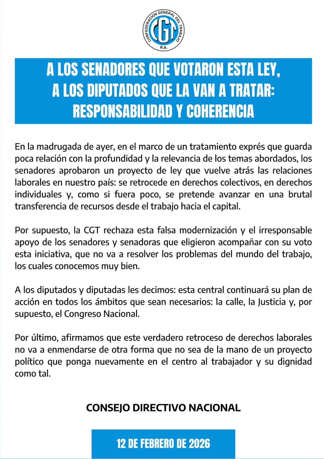 En un comunicado difundido este 12 de febrero, el Consejo Directivo Nacional de la CGT salió con dureza a cuestionar la aprobación en el Senado del proyecto de reforma laboral y apuntó directamente contra los legisladores que acompañaron la iniciativa. La central sindical calificó el tratamiento parlamentario como “exprés” y sostuvo que la norma implica un retroceso en derechos colectivos e individuales conquistados durante décadas.